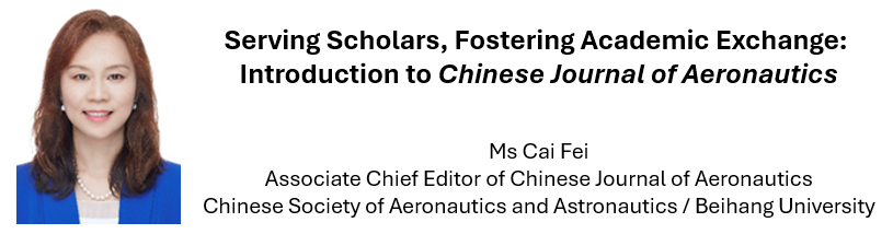 Ms Cai Fei has served as the Associate Chief Editor of Chinese Journal of Aeronautics (CJA)for over ten years. She has received the “Excellent Chief Editor” awards in the Excellent Action Plan for Chinese Science and Technology Journals. CJA’s international influence has rapidly increased in recent years. Its impact factor (5.7) ranks the second globally in 2023 Web of Science aerospace journals (SCI).